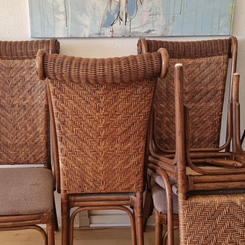 Sælger herved vores super flotte flettede spisebordsstole med flet og slankt forkromet stålstel, idet vi desværre ikke har plads til dem længerere.