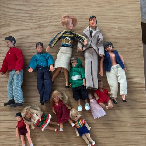 Samling dukker til dukkehus med mor, far, bedsteforældre, barn og to babyer i forskellige outfits. Flere af dukkerne har bevægelige led og tøj med små detaljer som bælte, skjorter og kjoler.