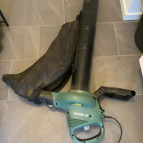 Bosch løvsuger med opsamlingspose. El-drevet model med bærehåndtag og rør til opsugning af blade og mindre haveaffald.