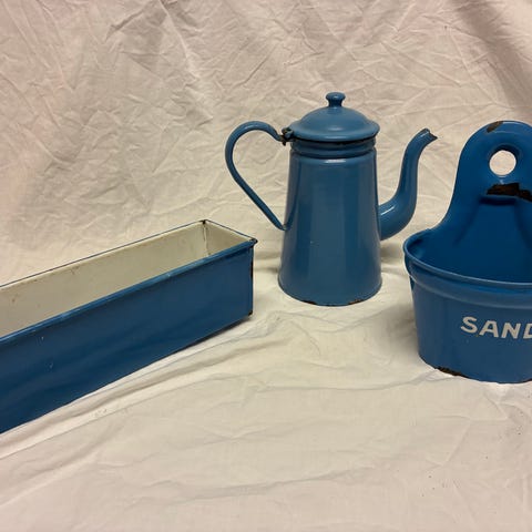 Mange forskellige Madam Blå køkkenting, bl.a. kedel, høj kaffekande og væghængt sæbebæger med teksten “SÆBE”. Flere dele har hank og låg samt huller til ophæng, fint til køkken, bryggers, kolonihaven eller sommerhuset!
