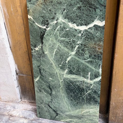 Sælger denne karakterfulde spisebordsplade i grøn marmor med unikke åretegninger. Perfekt til et DIY-projekt, hvor du selv vælger benene.