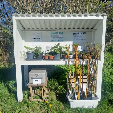 Vejbod med flettede piletræer, som fungerer som smukke levende skulpturer i haven, samt et varierende udvalg af planter efter årstiden.