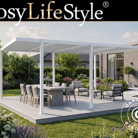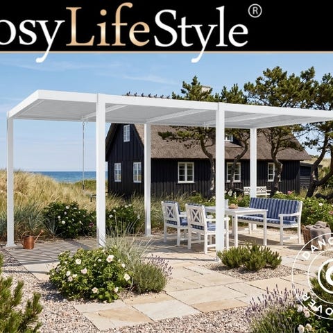 San Pablo Open Side er en moderne og elegant bioklimatisk pergola pavillon fremstillet i stærkt, vedligeholdelsesfrit pulverlakeret aluminium. Det karakteristiske design med et asymmetrisk placeret ben skaber en mere rummelig fornemmelse og giver pergola pavillon et let og arkitektonisk udtryk, som adskiller sig fra traditionelle konstruktioner. De justerbare taglameller betjenes nemt med et håndsving, så du kan regulere lys, skygge og ventilation efter behov. Du kan bestille en eller flere sidevægge/skærme separat.