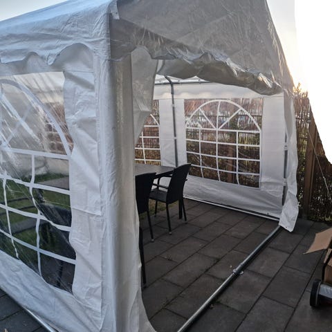 Festtelt 4 x 4 m. Teltet har kun været opsat en gang og brugt til opbevaring i forbindelse med renovering af udhus. Teltet kan ikke leveres, det skal afhentes i kollonihave først på Amager, postnummer 2300 S.
