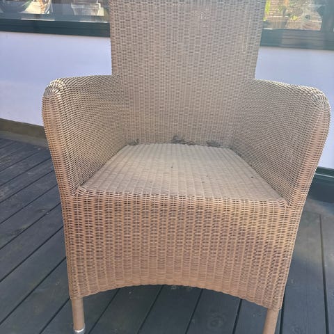 Kos havemøbelsæt i naturfarvet flet med rundt bord og 4 matchende stole. Bordet har plade med bræddelook og stolene har armlæn og høj ryg.