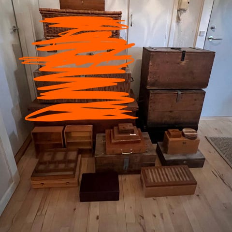Stor massiv købmandsdisk i lyst træ med 20 skuffer.