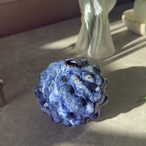 Skulptureret vase i glaseret stentøj af Rikke Elgaard i beige/olivengrøn og rosa glasur.
