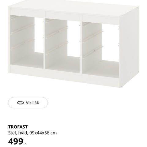 IKEA TROFAST hvid reol med tre rum og skinner til kasser, måler 99x44x56 cm.