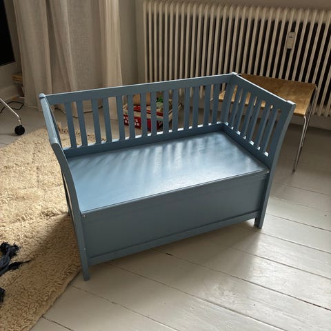 Rød børnebænk fra IKEA med ryglæn og armlæn. Sædet kan løftes op, så der er god opbevaringsplads under låget. Der kan være ret meget legetøj i. Jeg har købt den brugt som vintage IKEA, men kan ikke finde mærket. Indhold medfølger ikke.