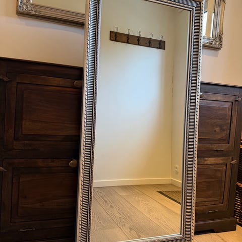 Flot spejl i gylden ramme med dekorative detaljer.