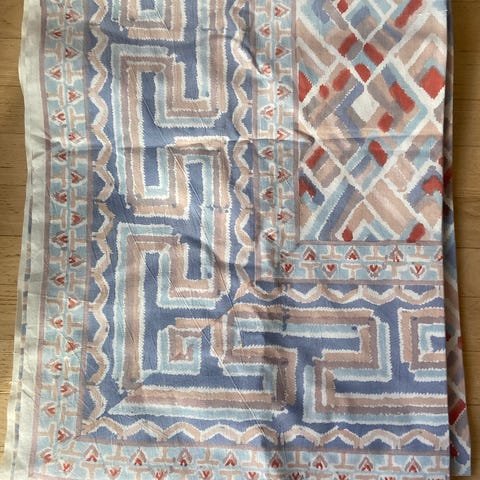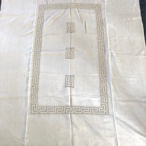 Stort stykke Stof, som er syet i enderne (se foto) og har været brugt som dug til en fest. Ingen defekter eller pletter.