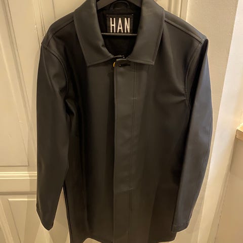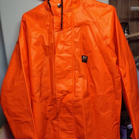 Gul Helly Hansen regnfrakke i str XL (sjældent i denne farve) med trykknapper foran. Har to store lommer foran og brun kant ved kraven, slis bagpå.