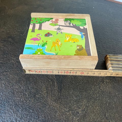 Fint lille memory spil i træ med farverige dyrebilleder på brikkerne. Brikkerne er kvadratiske og måler 5 cm på hver side.