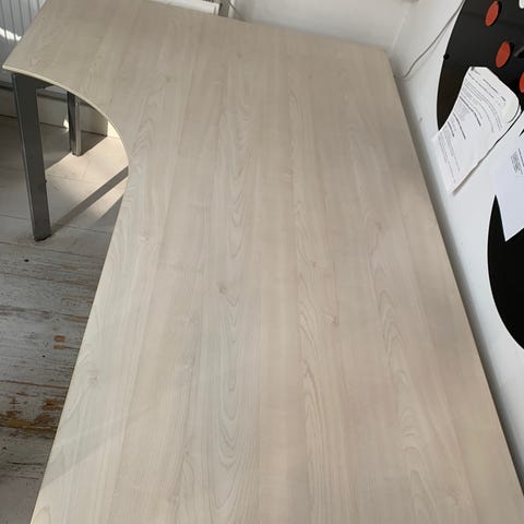 Bordet har elektrisk hæve/sænke-funktion og kabelbakke under bordet. LINAK-motor/styring. Buet front og god arbejdsplads med meget bordplads.