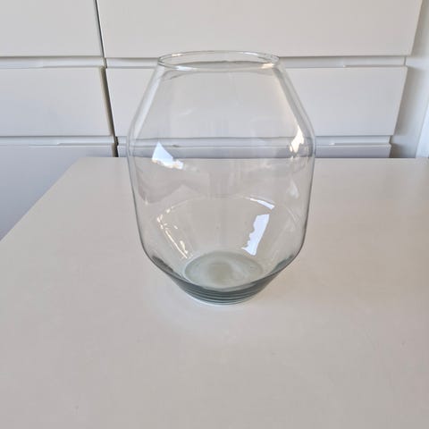 Rund glasvase fra Normann Copenhagen i klar glas med let struktur i overfladen. God størrelse til bord eller reol, se mål på billedet med tommestokken.