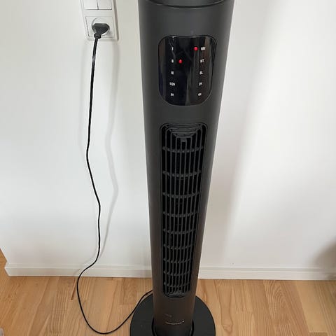 Sort elektrisk tårnvarmer med betjeningspanel i toppen. Der følger en lille fjernbetjening med, så den er nem at styre på afstand.