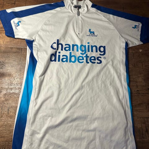 Nalini cykeltrøje i str XL, hvid med blå detaljer og Changing Diabetes tryk foran og bagpå. Har gennemgående lynlås, elastik i bund og lommer bagpå.
