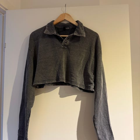 Sort H&M bluse i str M med lange ærmer og bred udskæring. Let, glat polyesterkvalitet med lidt rynkeeffekt i siden.