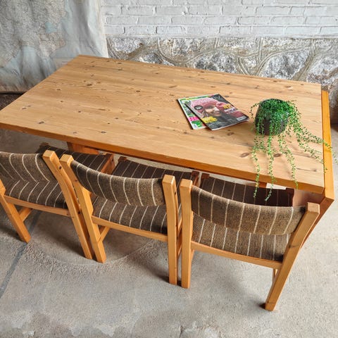 Langt spisebord 82x 220cm i fyrretræ. Købt i ca. 1980. Været med mig i alle årene. Flere flytninger. Har været malet i et par omgange. men bordpladen står i det naturlige træ. Foden er hvis. Kan evt. afsyres.