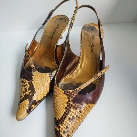 Dolce & Gabbana højhælede sko i brun ruskind i str 40. Indvendig har de leopardmønstret foer og spids snude.