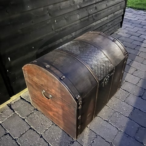 Flot udskåret træskrin/kiste med motiv hele vejen rundt og dekorativ messinglås foran. Indvendigt er der træramme/gitter og god plads til opbevaring.