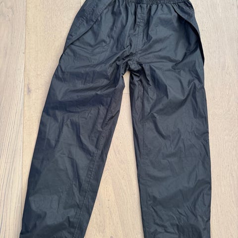 Sorte regn bukser i str 152 med elastik og snøre i livet. Har lige ben og trykt logo på siden.