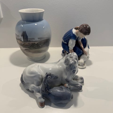 Samling af porcelænsfigurer med fugle, høns, ko og mennesker samt to vaser med landskabsmotiver. Sælges samlet som pynt til reolen eller vitrineskabet. Sælges samlet for 1000kr