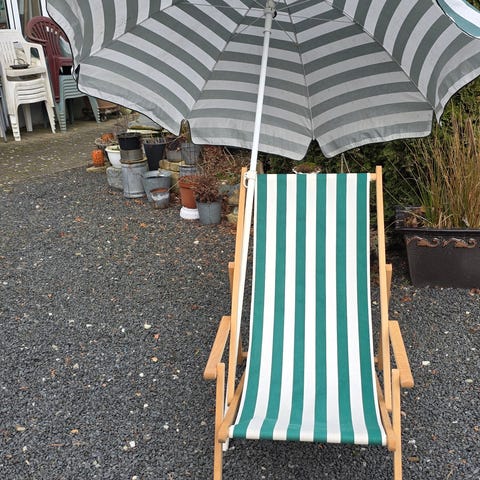 Liggestol med fodskammel. Velholdt, stået i havestue.