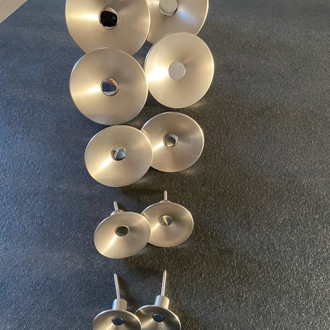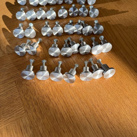 Pomolo U948 greb / knop fra Confalonieri, diameter 18 mm, tryktstøbt metal, satineret nikkelfinish. I alt 71 stk hvoraf de 50 er med skruer. Knopper er i god stand men nogle har lidt maling på som nemt kan skrabes af med en negl. Sælges helst samlet
