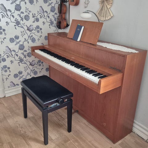 Andreas Christensen opretstående klaver i mørkt træ med klaplåg over tangenterne. Har to pedaler og enkel, klassisk front i træ.