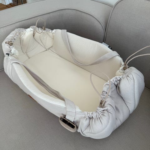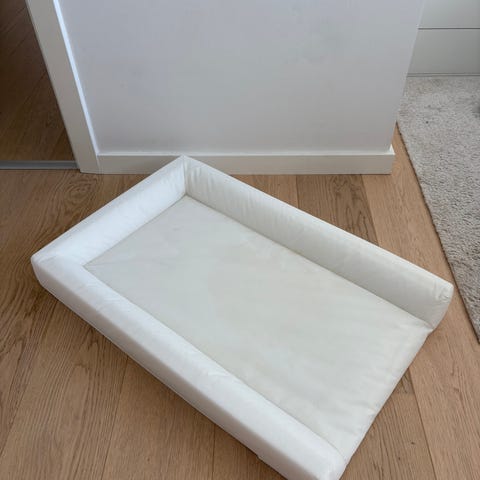 Hvid oppustelig puslepude fra IKEA med høje kanter hele vejen rundt. Let at tørre af og med glat overflade. Betræk kan medfølge.