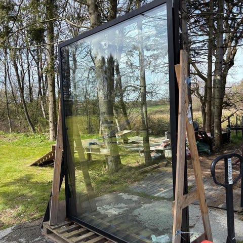 Stort vinduesparti med karm bortgives, fint til fx udestue. Har aldrig været monteret men har stået ude i 4 år højde 234 cm bredde 227 cm. Træ/alu med 3 lags glas