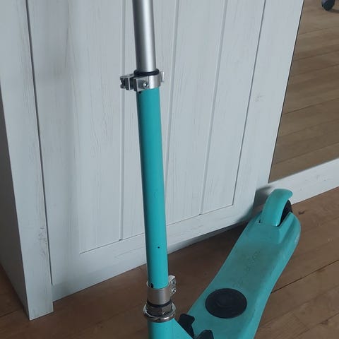 Micro løbehjul i lyseblå med sort ståbræt. Har justerbart styr og fodbremse bagpå. Fast pris - brugt til et barn.