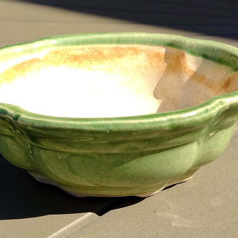 Bonsai skål af keramik med grøn glasur. Lavet som et foldet blad. Bemærk japanske skriftegn i bunden. Uperfektheder i glasuren er japansk stil og ikke skår. Diameter ca 14 cm. Højden varierer ca 6-8 cm. Med 3 bindehuller i bunden. Kr 150