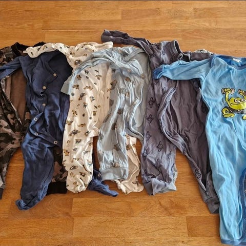 Pakke med drengetøj i str 74-110 i flere farver og mønstre. Blandt andet bluser, bukser og en hættetrøje med lynlås og snøre i taljen på nogle af bukserne.