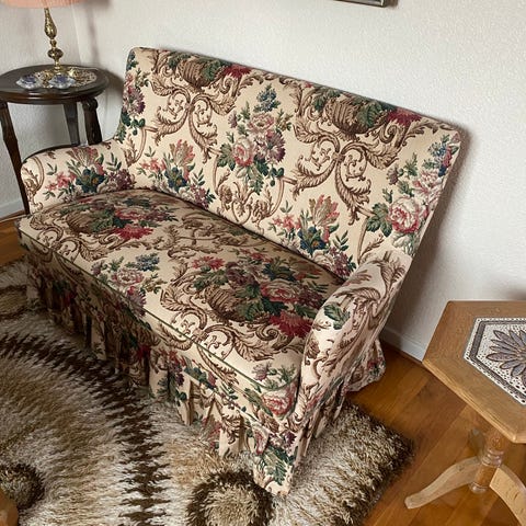 Helt unik lækker, kvalitetssofa med god siddekomfort. Ombetrukket med smukt kvalitetsbetræk med blomster og fugle i en rolig gammelrosa tone.