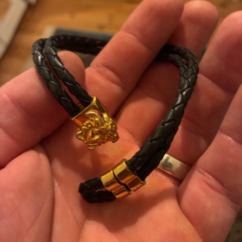 Versace forgyldt herre ring med Medusa motiv foran. Kraftig, bred ring med indgravering indeni og markant firkantet front. Er bestemt en ring som vækker opsigt blandt alle! Ny pris var omkring 2.500 kr. Kan mødes i Vejle og Odense ellers kan den også sendes med posten.
