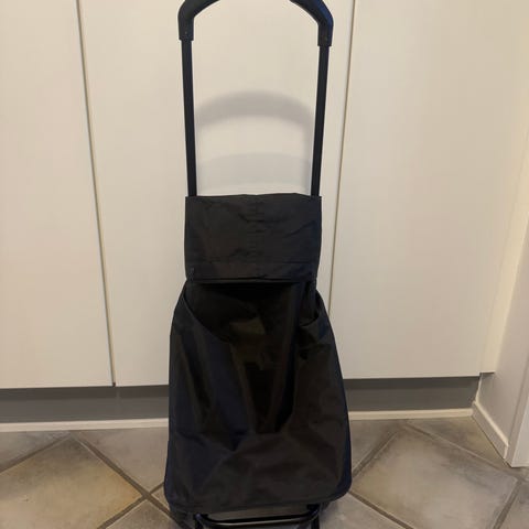 Sort indkøbsvogn på hjul med stort rum og køleforing indeni. Har solidt håndtag, to hjul.