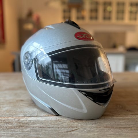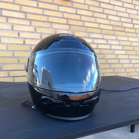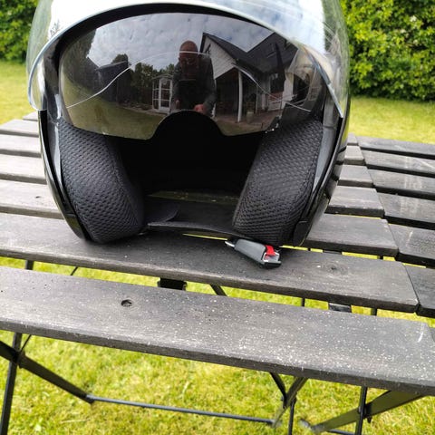 Nomo Design Moto Guzzi motorcykelhjelm i sort med sølvfarvet bånd og visir. Har blød polstring indeni og hagerem med spænde.