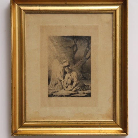 Motivet er klassisk religiøst, men gengivet med en moderne og spontan tilgang, hvor pensel- og pennestrøg giver kompositionen liv og bevægelse. Tegningen fremstår med tydelig kunstnerisk hånd og personlig karakter.
