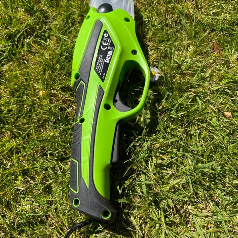 Lille grøn batteridrevet hækkeklipper/græssaks med sort håndtag og savtakket klinge. Har tænd/sluk-knap i bunden af håndtaget og opladerstik bagpå.