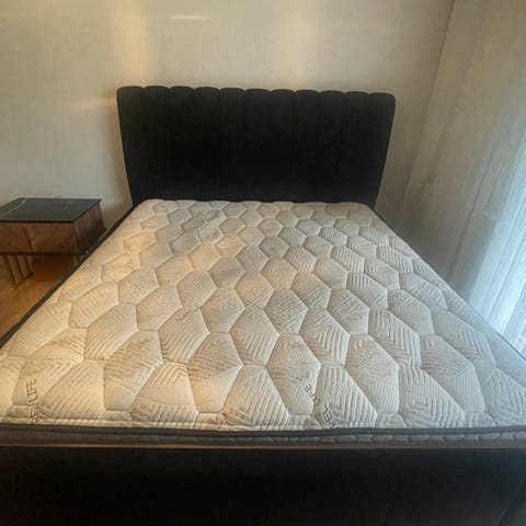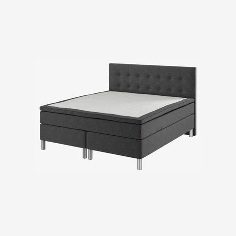 Ramme med ben, madrass, overmadrass og madrassbeskytter følger med.
