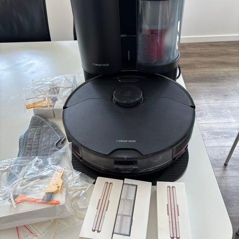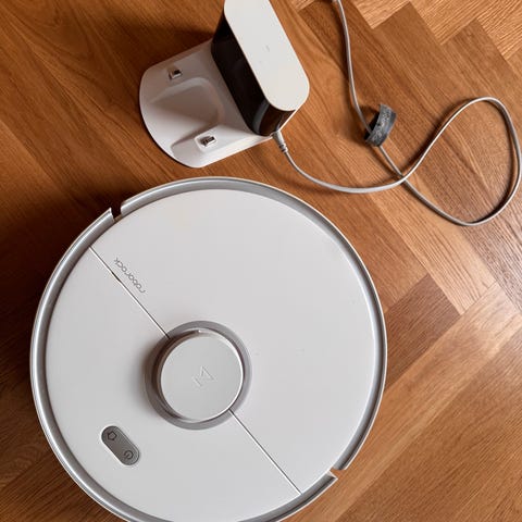 Roborock robotstøvsuger med stor dockingstation med flere beholdere. Smart løsning hvor støvsugeren selv kører op på basen efter rengøring.