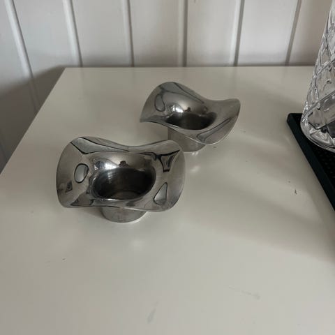 Lysestager i pletsølv.H 7,5 cm, B 7 cm.Kan pudses op, gå til varen, for flere billeder. Sælges som sæt.(A11).