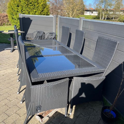 Stort havebord 195x100cm med 6 høje fletstole og hynder. Stolene har armlæn. Vippefunktionen virker kun på 1 stol. Sættet er brugt og har brugstegn herefter, ligesom det har stået ude året rundt og trænger til en forårsrengøring.