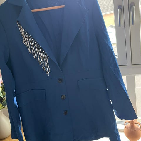 Skjorten/jakken er syet i klassisk skjorteblusefacon med revers, brystindsnit og brystlomme med klap i venstre side, i ryggen er der wienerlæg. Guldknapper og fin rynkedetalje ved håndled