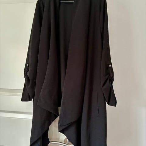 Sort cardigan fra Gozzip str.46/48. Der er knapper og lommer. Den er noget længere bagpå end foran.viskose-nylon -elasthan