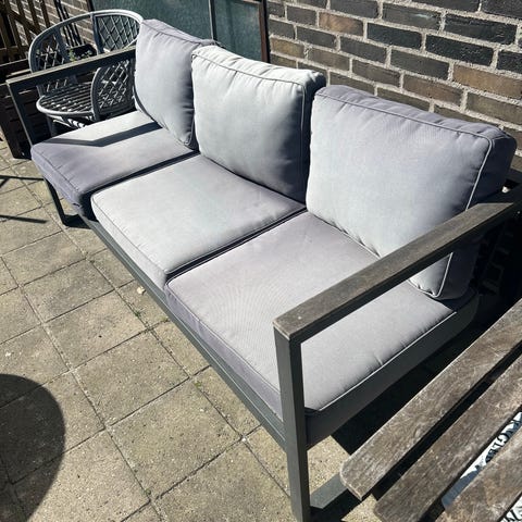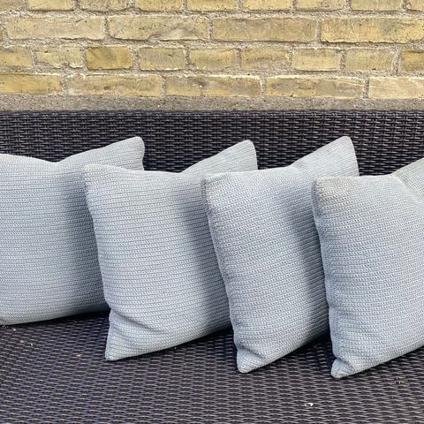Mangler du puder/hynder til et projekt? 4 grå hynder/puder med fyld, gode til sofa eller altan. Betrækket har lynlås, så det er nemt at tage af og på.