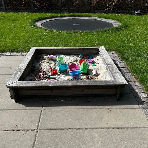 Nordic play sandkasse i træ til haven, ramme af brædder som er samlet til en firkant. Der følger ekstra brædder med, som skal have nye beslag og kan fungere som låg/bænk.