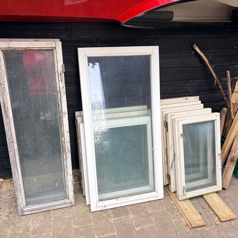 Flere løse vinduesglas og ruder i forskellige størrelser. Flest i 60*180 cm. Ca. 18 stk